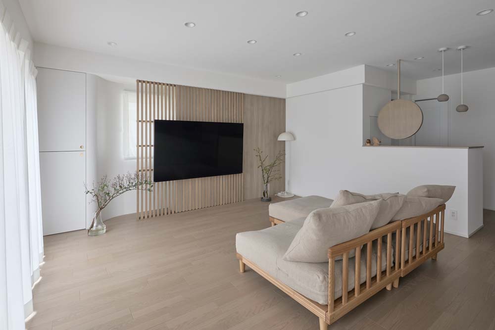 キッチン横と正面の2方向に窓がある角部屋という好条件を活かし、日当たりや風通しはそのままに、より快適な空間へリノベーションした物件。窓の前にルーバーを取り付け、壁掛けテレビを配置することで採光を確保。さらに、ルーバーの裏にはあえてデッドスペースを作り、実用的な収納場所を設けています。ルーバーにより視線が抜けて奥行き感が生まれ、LDK全体に開放感をもたらしています。