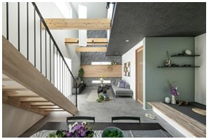 脱炭素社会の実現に向け、省エネルギー性能に優れた住宅の普及が進んでいます。断熱性能を考慮し、大きさを抑えた窓から差し込む「斜光」のうつろいを感じながら、家族の気配が柔らかくつながるように、上下階の接続部に「曲線」を多用した都内狭小3階建ての住宅です。