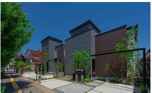 風致地区の建築条件において、建蔽率には算入されないよう 2 階を跳ねだし、軒下空間をつくった全5棟の分譲住宅です。後退部分を活用した外部空間をデザインし、空間を感覚的に領域分けする閾(いき)として門型フレームを設置しました。周囲を柔らかく覆う雑木を配し、居場所がウチからソトへグラデーションのように染み出していく住まいです。