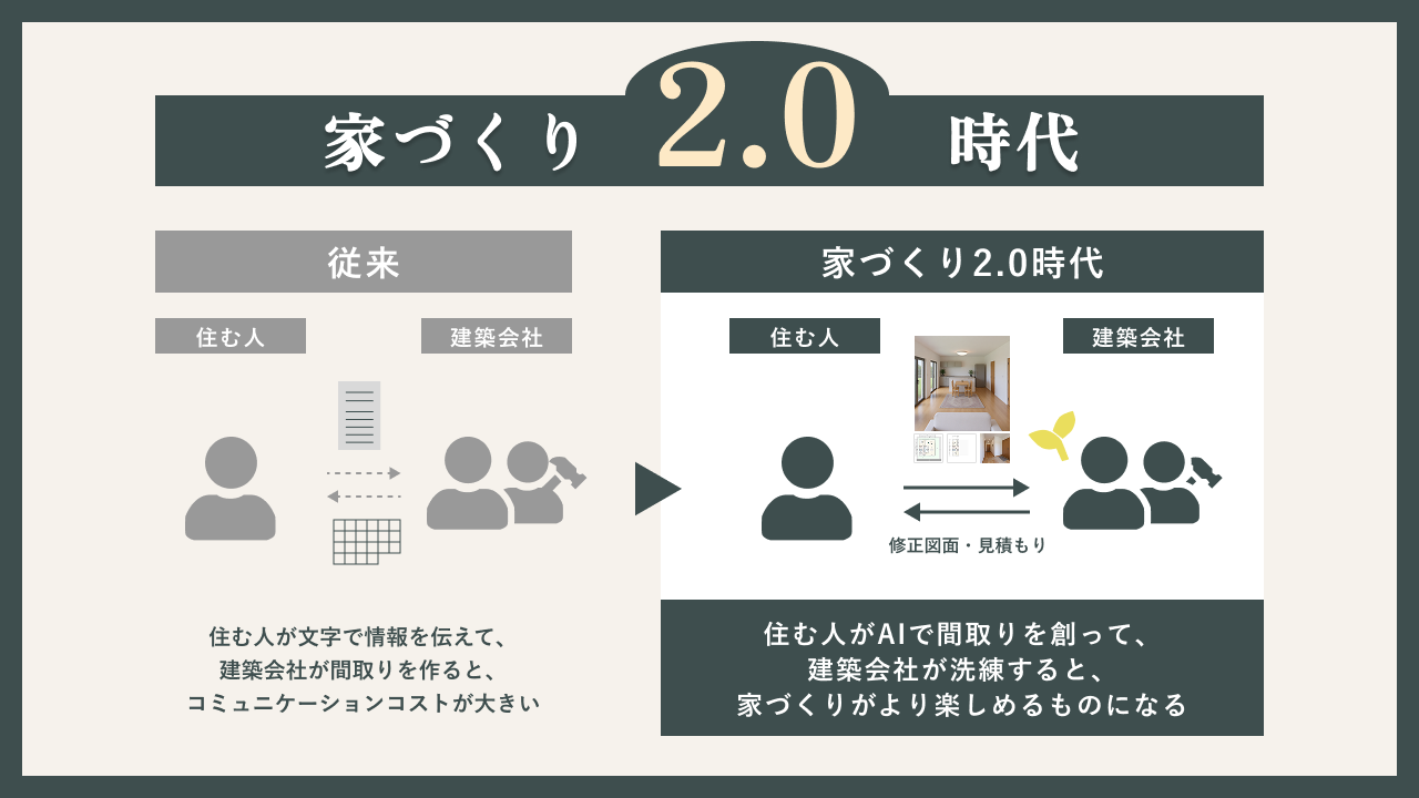 従来、家を建てる施主がそのような要望を設計士に伝えても、間取りに反映されるまでには1週間程度かかっていました。設計士は施主の数多くの要望に対応するために長時間働き、施主は何時間にも及ぶヒアリングで疲弊していました。