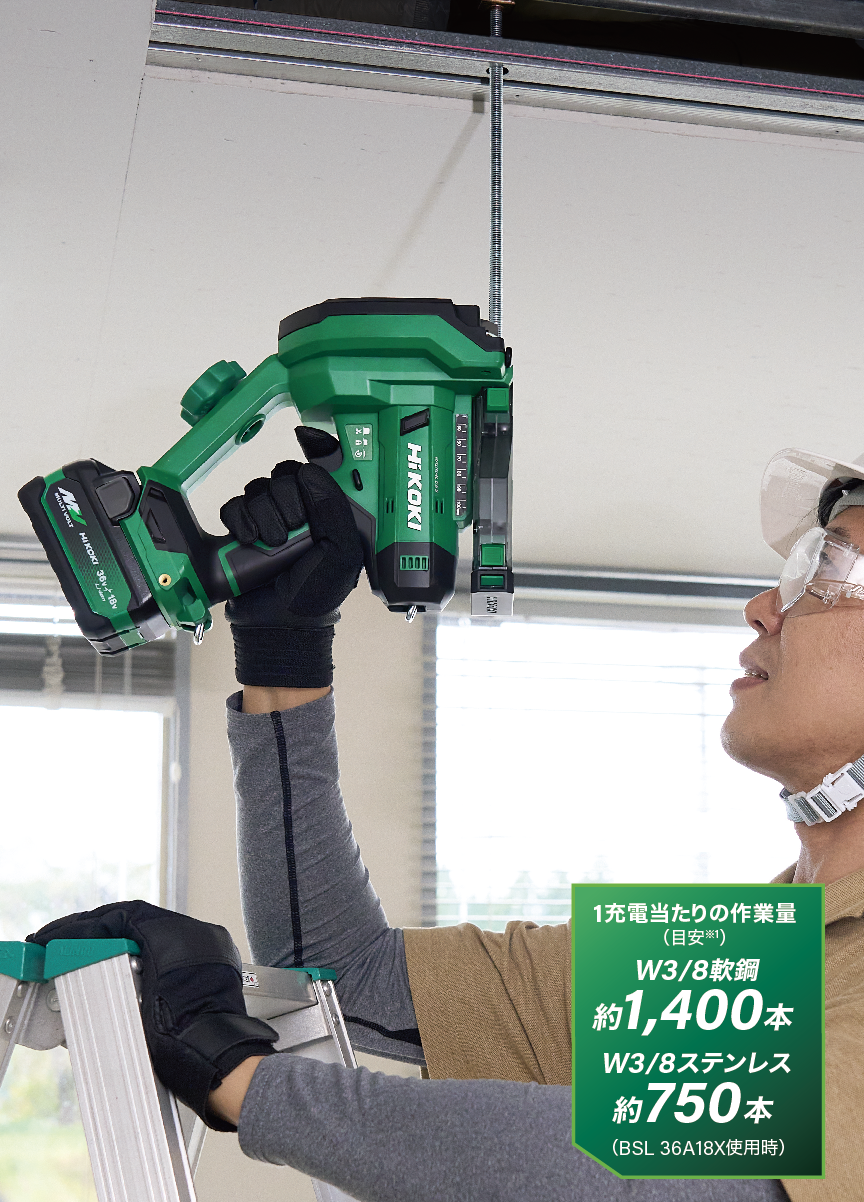 軟鋼W1/2など太径全ねじまで力強く切断でき、従来より少ない力でスムーズに作業できます。1充電あたりの作業量(目安※1)も向上し、W3/8軟鋼で約1,400本、W3/8ステンレスで約750本を切断可能。現場の連続作業効率を大幅に高めます。