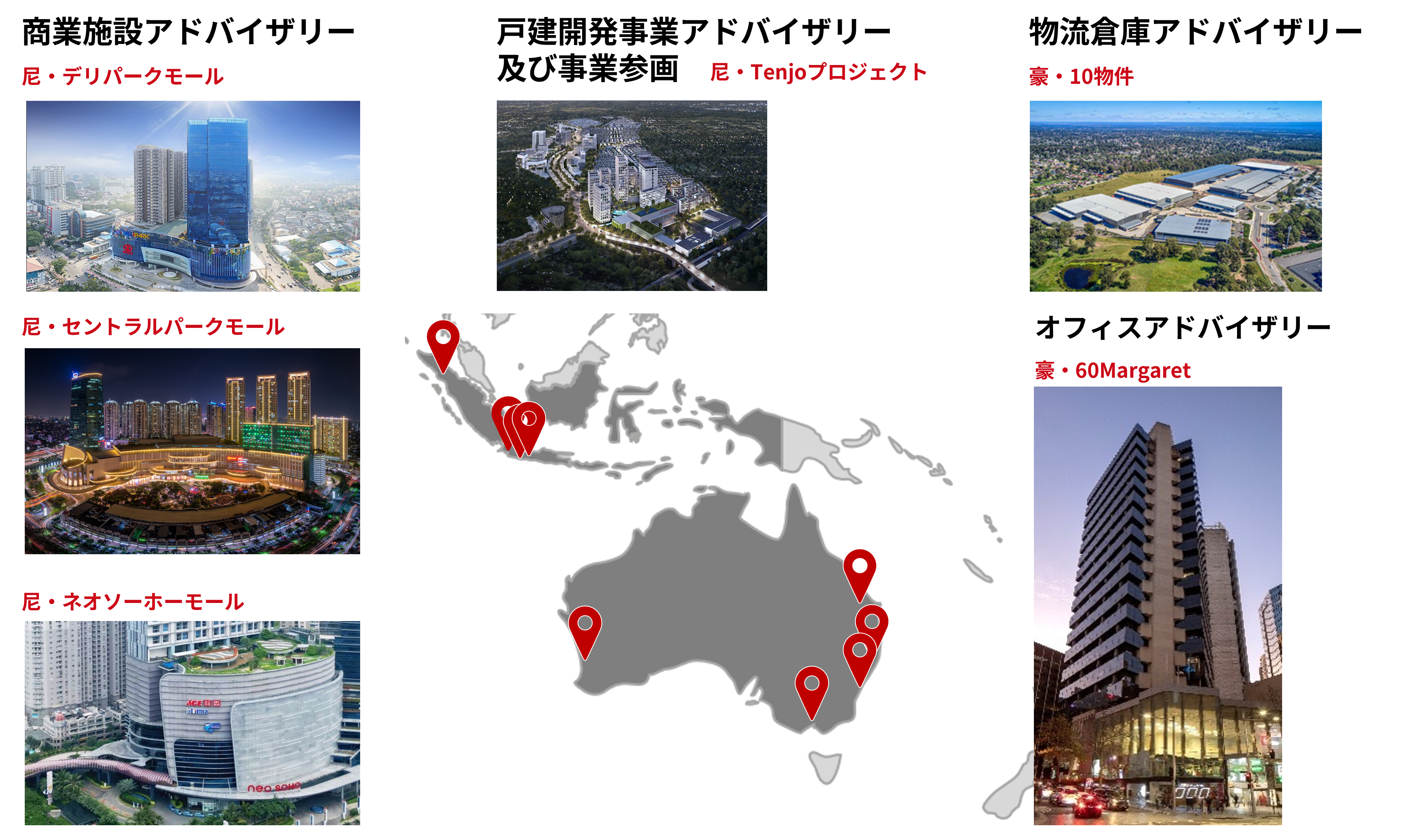 当社グループは、「世界中のあらゆる世代のライフサポートカンパニー」として、国内で培った不動産事業のノウハウを海外へ展開しています。当社グループのアドバイザリー事業は、現地での実業経験(デベロッパー・ファンド運営)に基づく「実行力」に強みを持っています。これまでに資産評価額ベースで5,000億円以上のクロスボーダー取引を支援しており、その対象エリアもインドネシアに加え、豪州へと拡大しています。