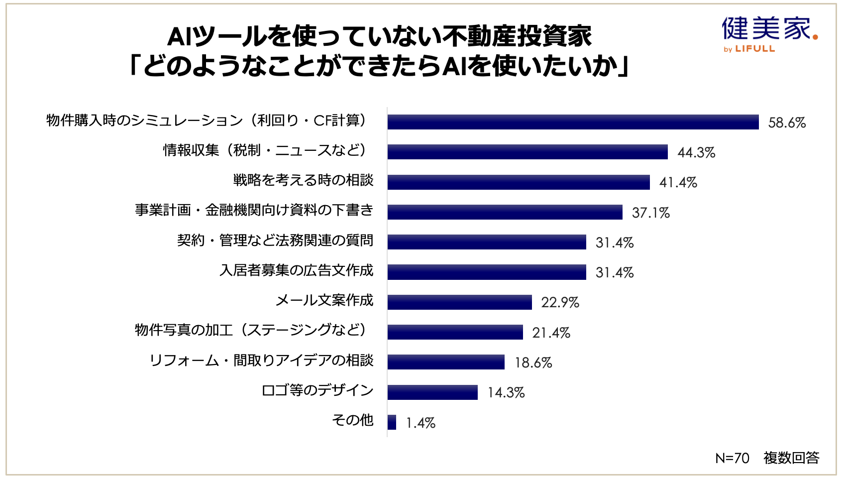 健美家が実施した『AIツールの利用に関する不動産投資家アンケート』(2025年8月)によると、不動産投資家の42.0%がすでにAIツールを利用しており[図10]、その利用目的の第1位は「戦略を考える時の相談(58.5%)」でした。これは「メール・文章作成(47.2%)」や「物件のシミュレーション(39.6%)」を上回る数字です。「客付けのアイデア出し」や「リフォームプランの相談」、「融資戦略の壁打ち相手」としてAIを活用する動きが広がっており、投資家がAIに対し、客観的な意見や多角的な視点を提供してくれるパートナーとしての価値を見出していることがわかります。[図11]