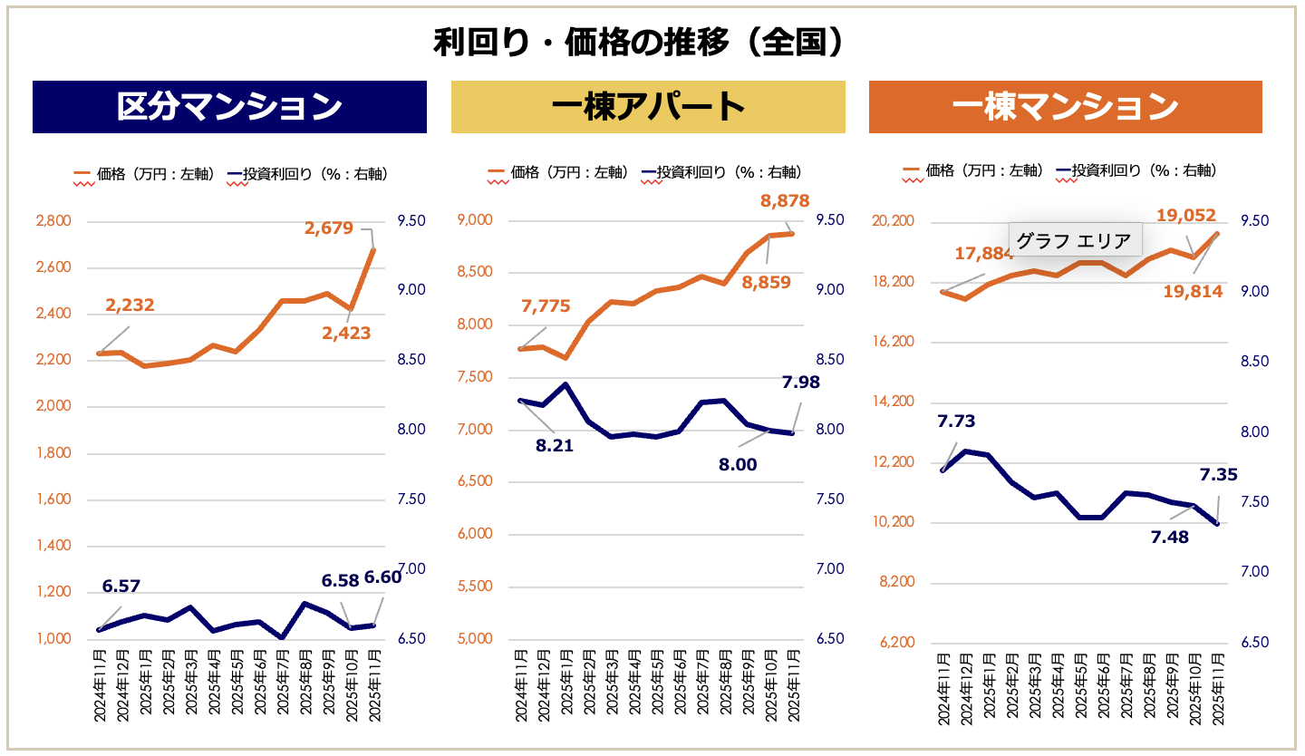 『収益物件 市場動向マンスリーレポート』(2025年11月期)によると、全種別(投資用区分マンション・一棟アパート・一棟マンション)で直近12年の最高値を更新しました。中でも、区分マンションの価格は前月比+10.57%と急騰しています。利回り面で見ると、一棟系(アパート・マンション)は価格上昇に伴い低下傾向にある一方、区分マンションは6%台後半で横ばいを維持していますが、いずれにせよ過去と比較して低水準であることに変わりはありません。[図3]