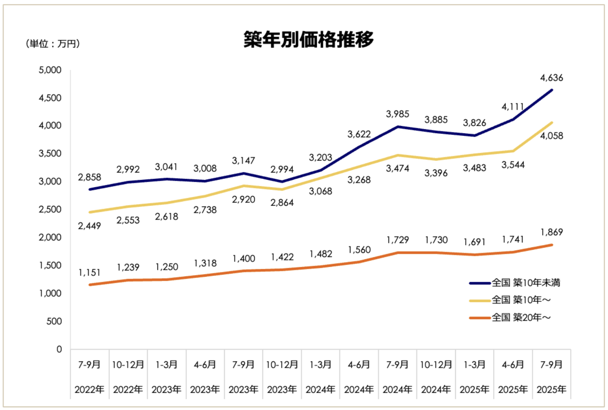 『収益物件 市場動向四半期レポート』(2025年7〜9月期)によると、全国の区分マンション(築20年以上)の平均価格は、この3年間で約1.6倍(1,151万円→1,869万円)にまで上昇しました。新築・築浅だけでなく、築古物件にまで価格上昇が波及している今、従来の「築年数が経てば家賃を下げる」という図式では、購入価格に見合う収益を確保することが難しくなっているのです。[図8]