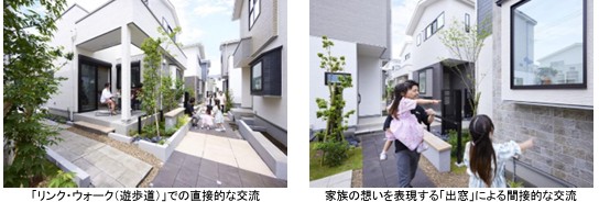 安全と交流を目的とした歩行者専用の「リンク・ウォーク(遊歩道)」と、住民が集う「リンク・テラス(広場)」、SNSに載せる写真の一枚のような「出窓」を街中に組み込んだ分譲住宅です。住民同士の直接的、間接的な交流によって、時間や場所、年齢、家族構成に捉われずにコミュニティを創出します。