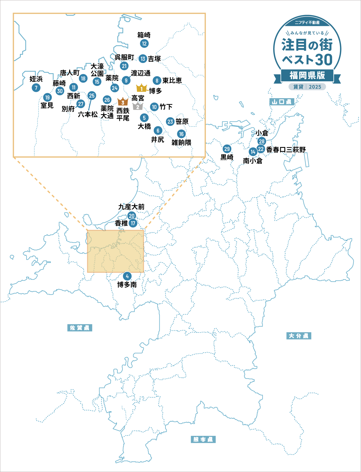 今回は、福岡県で賃貸物件を探しているユーザーからの注目を集めた街ランキング(ベスト30・2025年)を発表いたします。