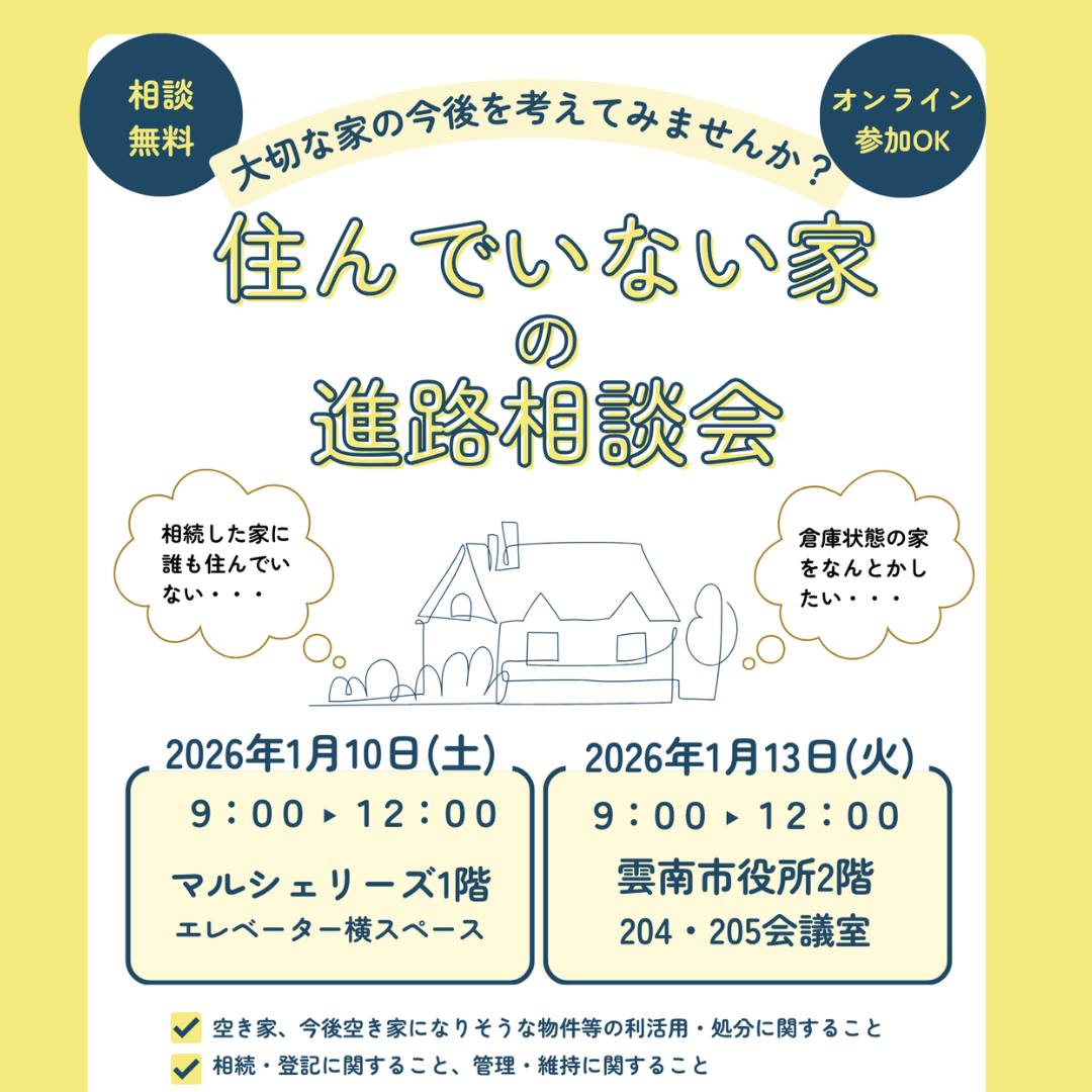 公益財団法人うんなんコミュニティ財団(島根県雲南市、代表理事 郷原剛志)は、2026年1月10日及び1月13日に[住んでいない家の進路相談会]を開催します。この相談会は、島根県雲南市に空き家等の不動産を所有している人を主なターゲットとし、利活用事例や相続・登記等を専門家に相談することを通じて、地域で不動産利活用が促進されることを目指しています。