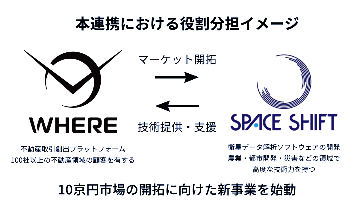 株式会社WHERE(本社:東京都文京区、代表取締役:阿久 津岳生 以下「WHERE」)と株式会社スペースシフト(本社:東京都千代田区、代表取締役:金本 成生 以下「スペースシフト」)は、人工衛星データを利活用した不動産関連ソリューションに取り組むため、MOUを締結したことをお知らせします。さらにWHEREは、スペースシフトが運営する事業共創プログラム「SateBiz」への参画を通じ、両者の連携をより一層加速させていきます。