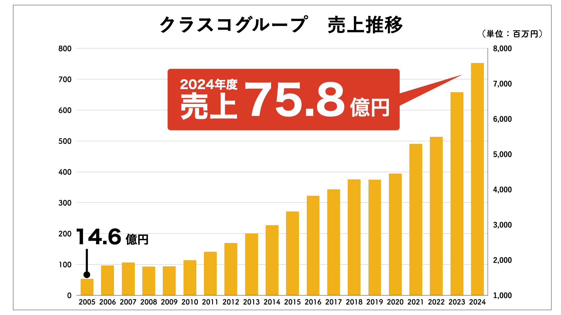 不動産仲介・管理・リノベーション・不動産テクノロジー事業を展開する、クラスコグループ(本社:石川県金沢市、代表:小村典弘、以下「クラスコ」)は、2024年度のグループ売上高が、過去最高となる75.8億円に達したことをお知らせいたします。