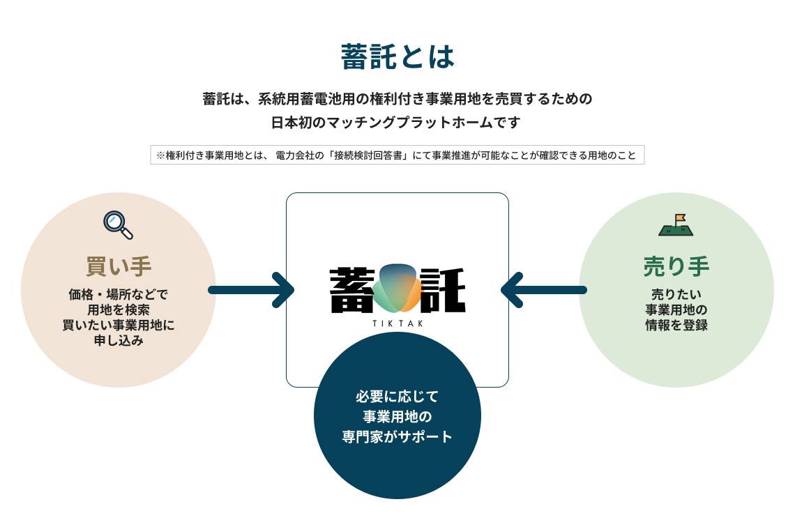 「蓄託(TIK TAK/チクタク)」は、運用開始までを急がれる事業者様や、希望するエリア(電力管轄)で事業用地をお探しの方、周辺環境への配慮を重視される方などに向けて、事業推進に適した用地の選定・取得を支援するプラットフォームです。