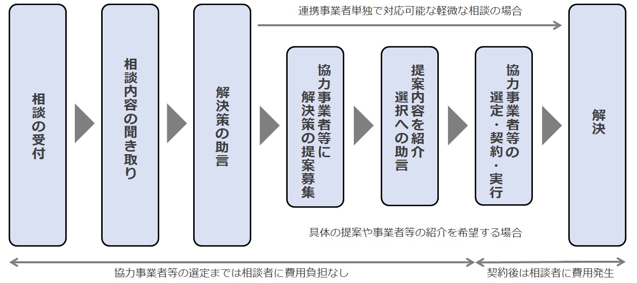 電話やインターネットを介して、空家所有者や予備軍の相談対応と与件整理、問題解決の方向性と具体的な対処方法を提案、そのために必要な事業者(売買・賃貸、家財整理、解体、リフォーム、庭木剪定など)をご紹介、マッチングまでを支援することで、抱えている悩みの解決、空家の発生抑制、空家の流通及び活用、除却の促進をしていきます。
