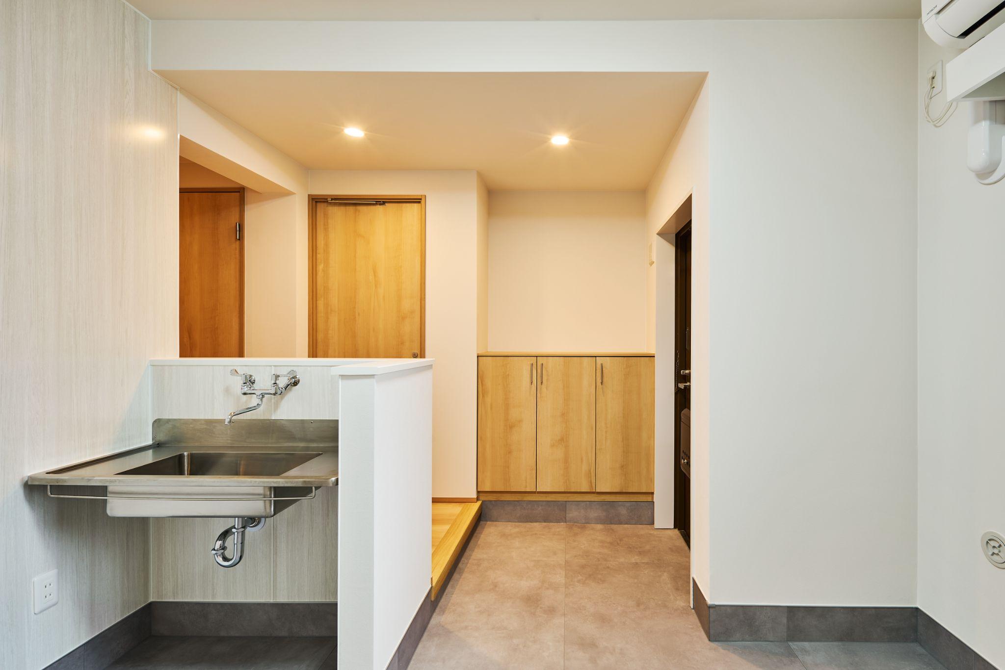 専有部は、子育てを快適にする広々とした玄関土間や、くつろぎと遊び場を兼ね備えた小上がりスペースなど、子育て世帯に優しいプランニングを行っています。アップサイクル建材を天井や壁に使用し、リノベーション工事で出た畳やカーテンの廃材をアップサイクルしたおもちゃをキッズコーナーに用意。SDGsを身近に感じられる仕掛けを作りました。