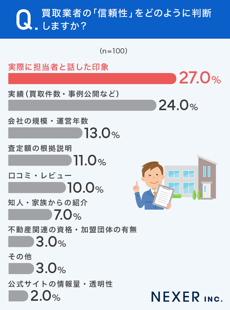 買取業者の信頼性の判断基準は、「実際に担当者と話した印象」が27%でトップとなり、対面での感覚や担当者の人柄が最も重視される結果となりました。