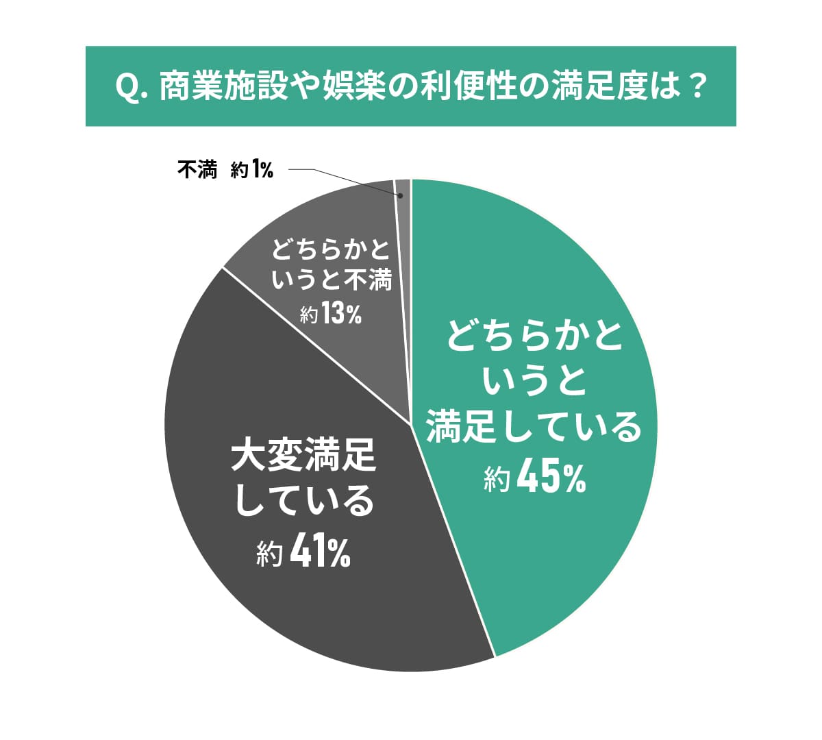 商業施設・娯楽については約86%の住民が満足しており、高い評価を得ています。「大変満足している」と「どちらかというと満足している」がほぼ同率となっています。