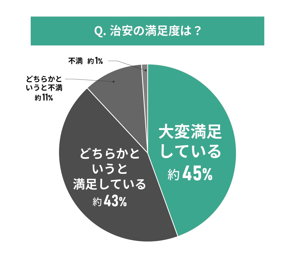 治安については約89%の住民が満足しており、非常に高い評価を得ています。「大変満足している」が約45%と最も多く、文京区の治安の良さが際立つ結果となりました。