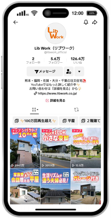 「Lib Work ch」ではルームツアー動画を主に配信するほか、「3Dプリンター住宅の開発秘話」や「各メーカーのキッチン等比較動画」など、当社独自のコンテンツも積極的に発信を行っております。20分間のルームツアー動画では約200万回、1分間のショート動画では約300万回の再生回数を超えた動画もあり、1コンテンツに対し平均約9万回の再生回数を維持しております。