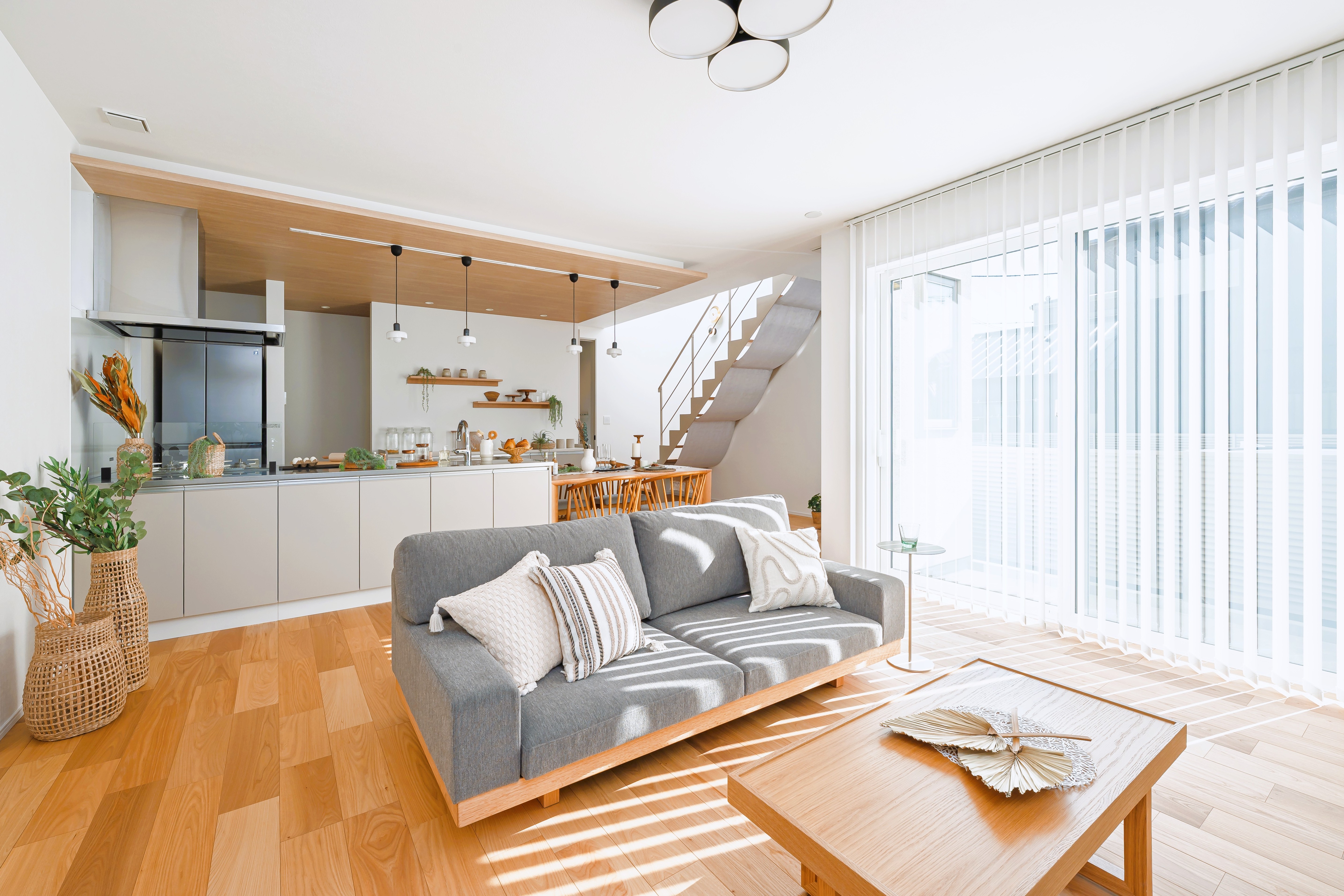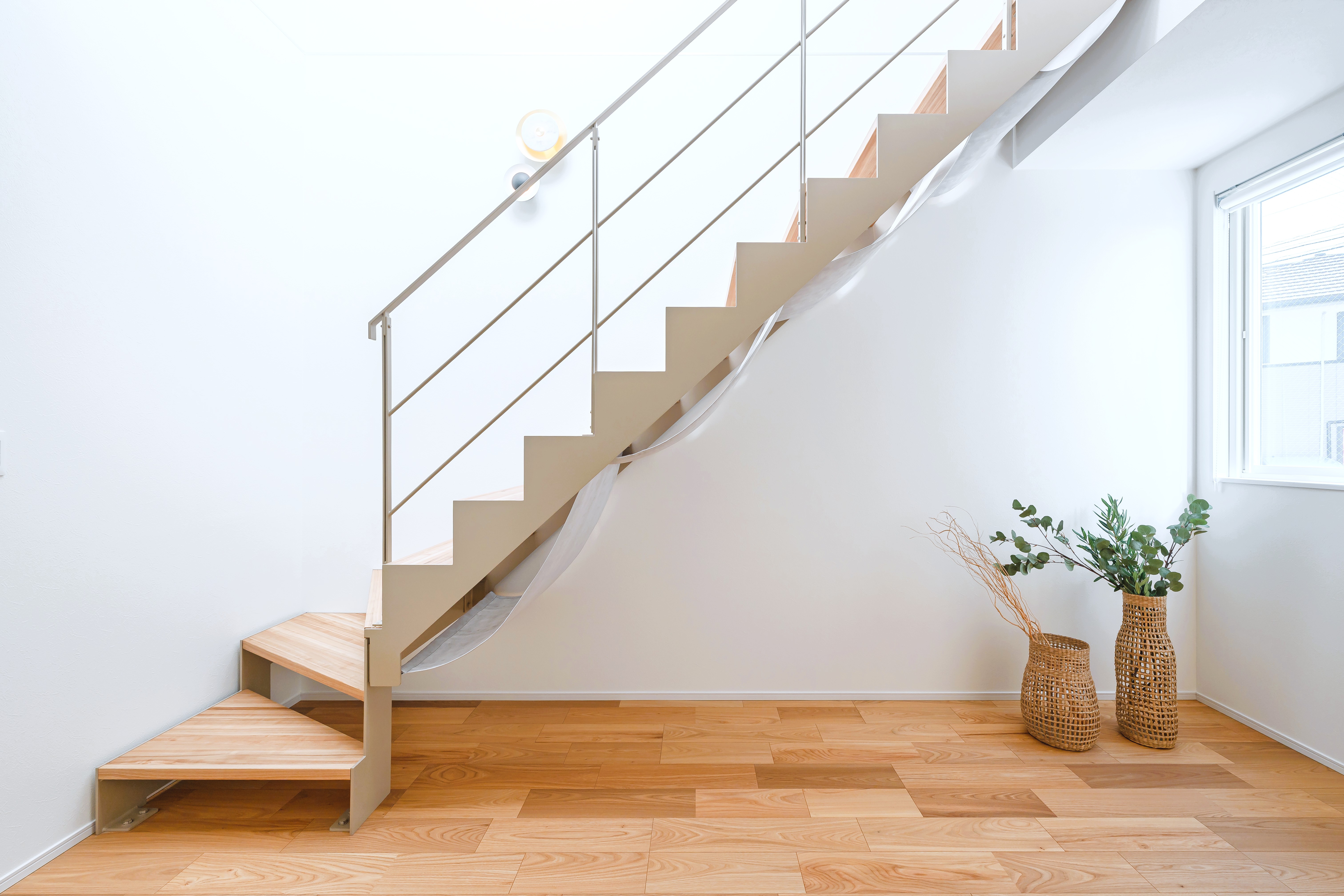 本建物は、当社が開発した「CLTハイブリッド構法」による住宅商品「CLT MASTERS(シーエルティーマスターズ)」の戸建て住宅のモデルハウスです。階段には、当社のプライベートブランド「CRAFT plus(クラフトプラス)」の室内用鉄骨階段を採用し、ナチュラルなカラーを組み合わせました。また、リビングの大開口窓に面したセミクローズの中庭により、開放感とプライバシーを両立したゆとりのある住まい空間を実現しています。
