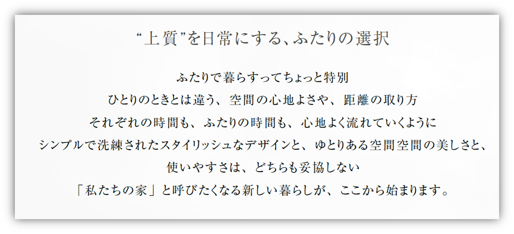 “上質を日常にする、ふたりの選択”という新たなコンセプトを加え、ふたりで暮らす生活をより心地よくするための空間・導線・設備を備えたDINKS向け賃貸マンションシリーズです。