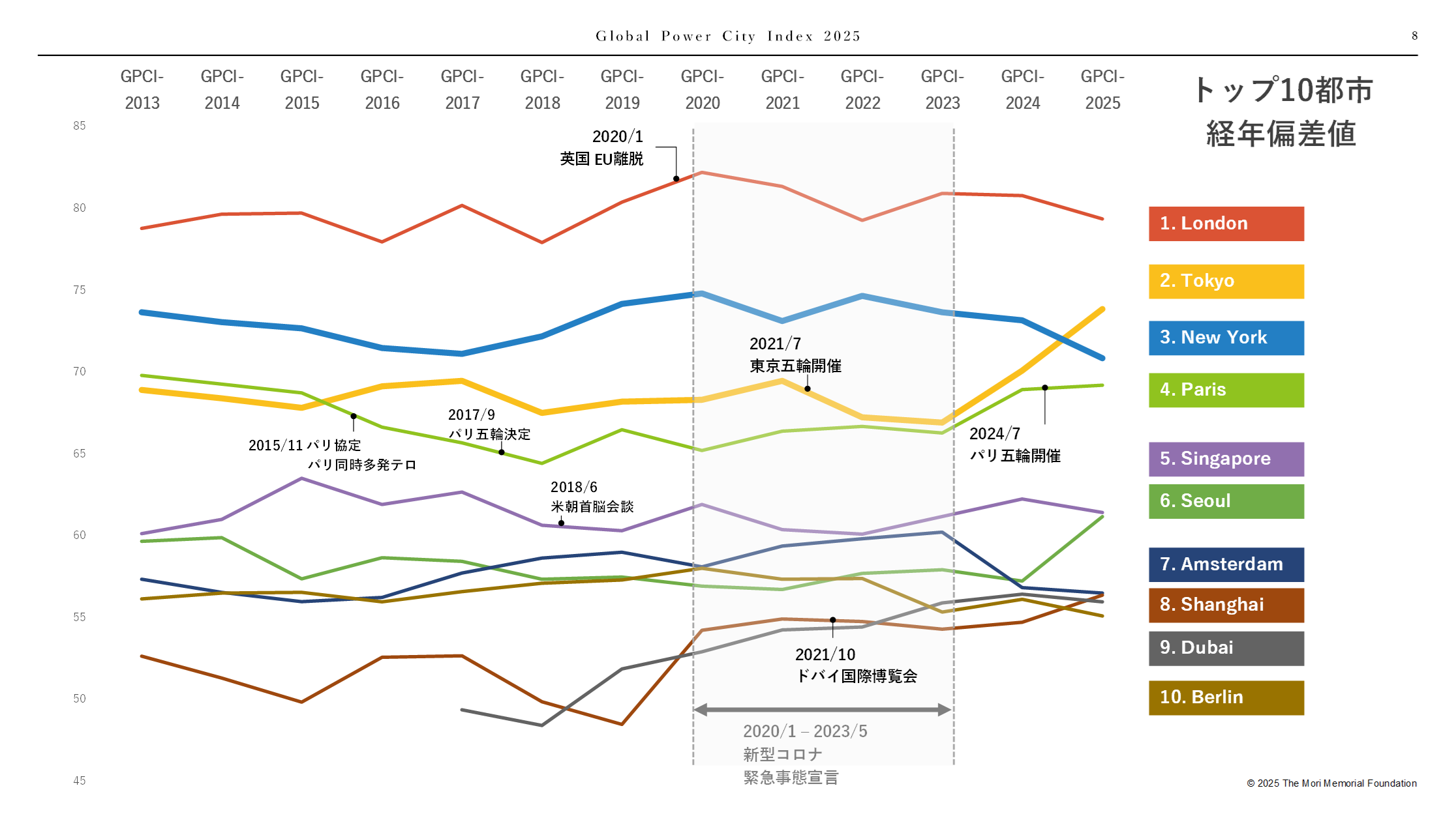 市川所長:よろしくお願いします。今年の大きなニュースは、先日(2025年12月17日)発表された「2025年世界都市ランキング」(森記念財団 都市戦略研究所)において東京が初めて2位に上昇したことです。従来はロンドン、ニューヨーク、東京の順でしたが、今回はニューヨークを抜きました。