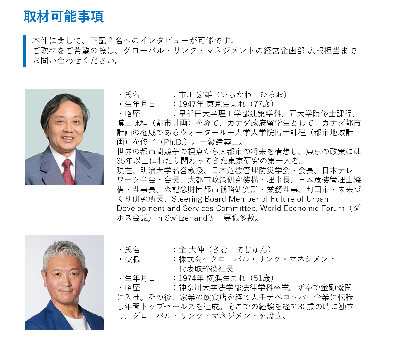 投資用不動産を扱う株式会社グローバル・リンク・マネジメント(本社:東京都渋谷区、以下GLM)は、(1)東京という都市を分析しその魅力を世界に向けて発信すること、(2)不動産を核とした新しいサービスの開発等を目的に、明治大学名誉教授・森記念財団理事である市川宏雄氏を所長に迎え、「グローバル都市不動産研究所(以下、同研究所)」を2019年1月1日に設立しました。