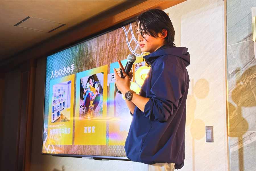 プレゼンテーションでは、就職活動中にニッカホームと出会った背景から、入社後に直面した課題、そして現場で経験した成長や仕事への向き合い方について、自身の言葉で語りました。