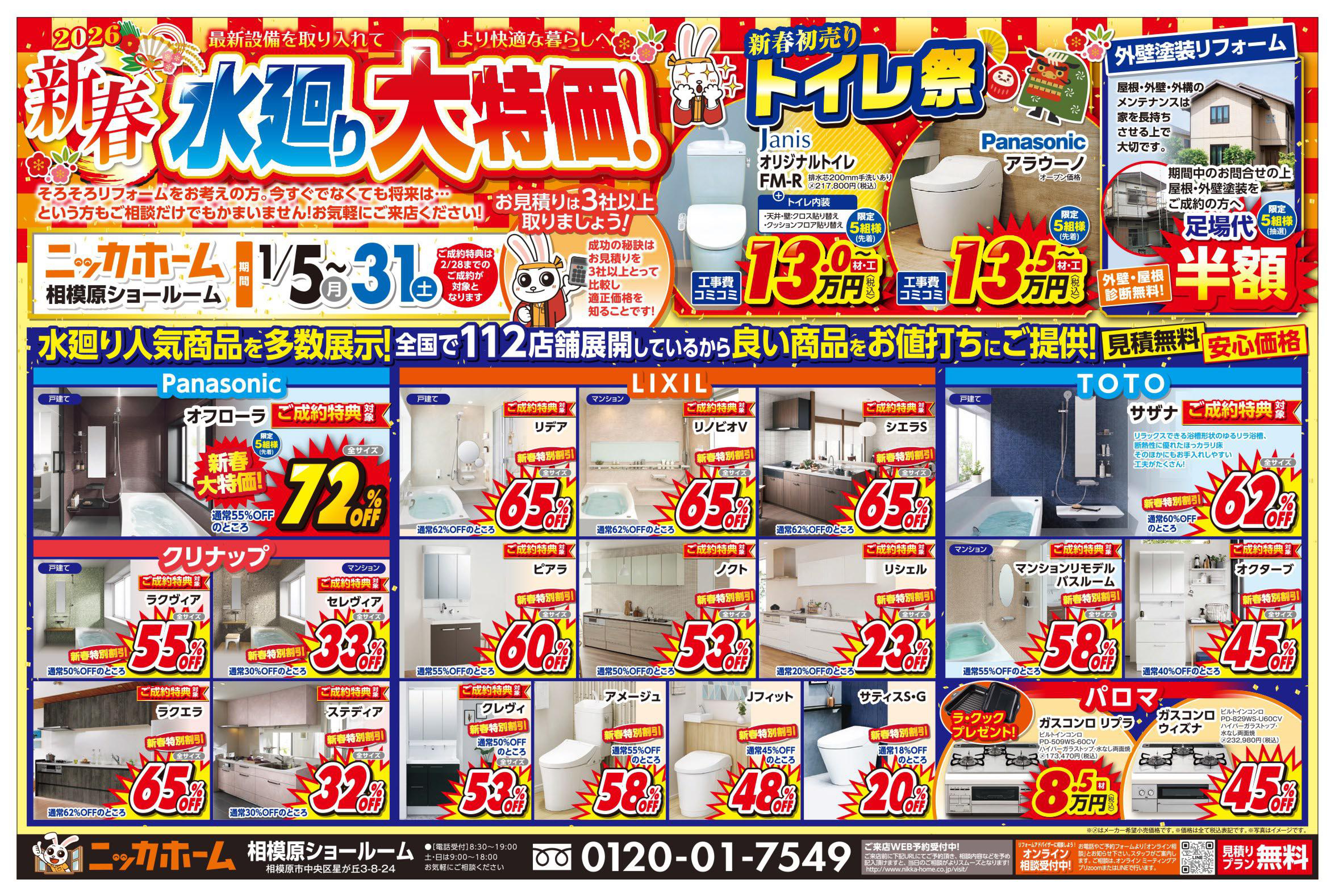 全国100店舗以上展開!2026年に創業39周年を迎える、リフォーム&増改築 ニッカホーム株式会社 (本社:愛知県名古屋市緑区篭⼭、代表取締役社長:西田裕久、以下 ニッカホーム)の関東エリア・ニッカホーム相模原ショールーム にて、26年1月5日より「新春初売りキャンペーン」を開催します!