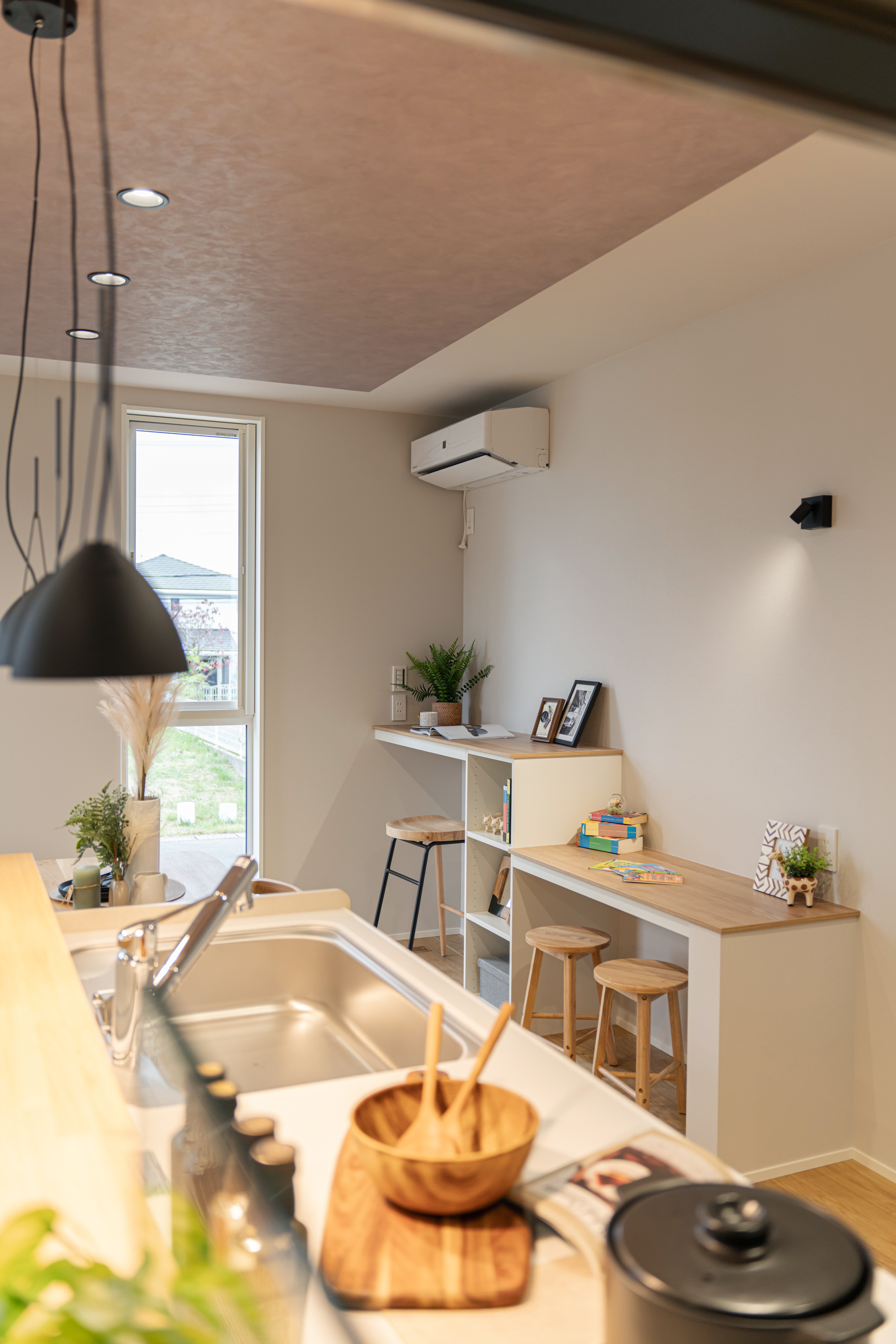 1階は家族が集まるLDKの隅にワークスペースを設け、お子様の宿題を目の届く場所から家事をしながら見守ることができます。リビング奥に設けたヌックは、家族と一緒にいながらも、秘密基地のような、わくわくする特別な空間を演出。