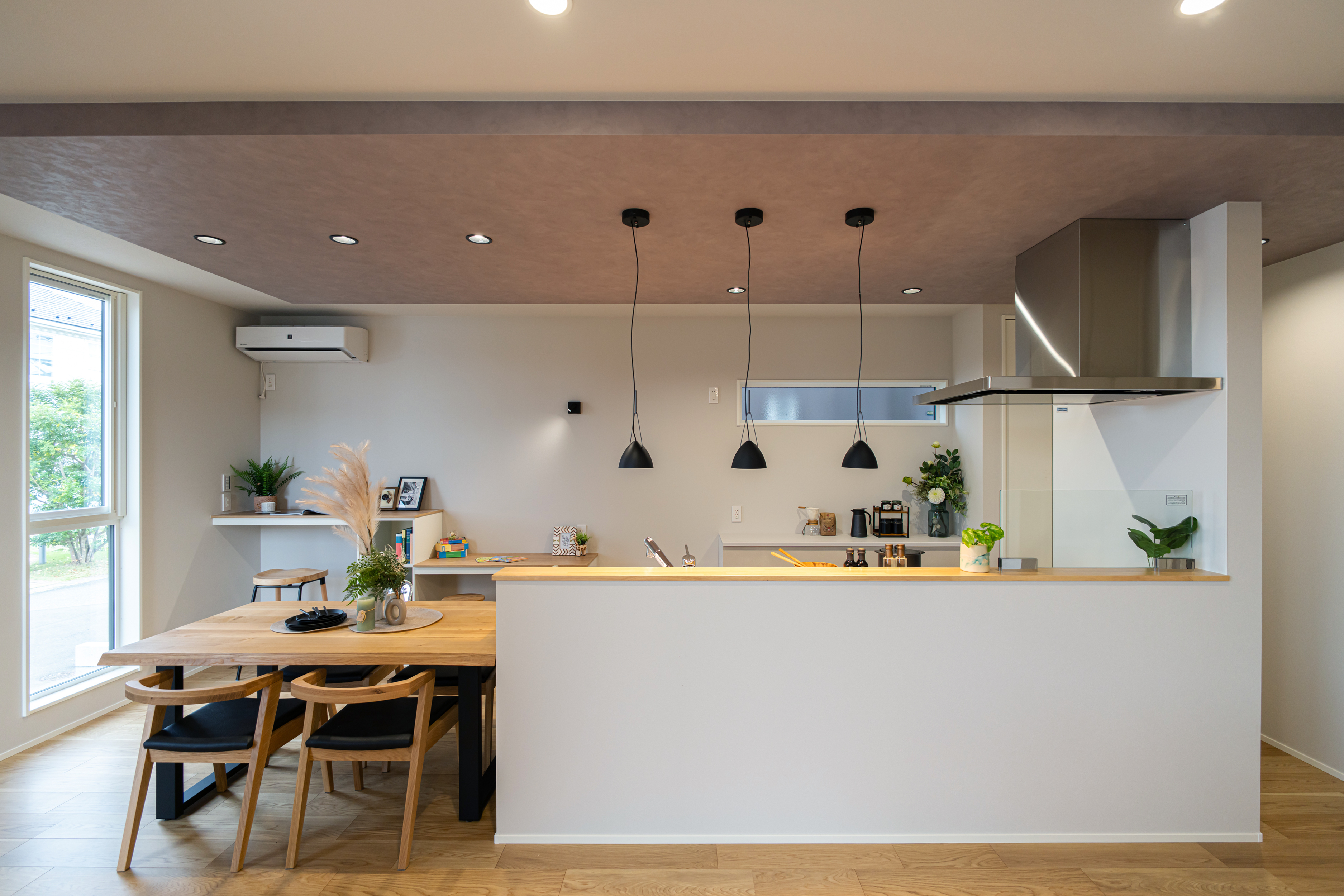 内装全体は、白を基調とした優しく明るいコーディネート。特別感のあるヌックは、落ち着いたスモークグリーンでまとめました。