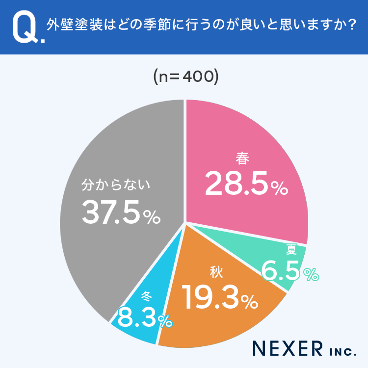 外壁塗装は「春」が28.5%で最多でしたが、「分からない」も37.5%と高く、季節選びに迷う人が多いことが分かります。