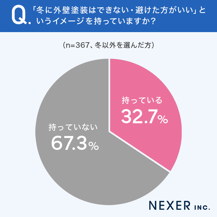 「冬は外壁塗装に不向き」というイメージを「持っていない方」が67.3%と多数派で、冬施工への抵抗感は必ずしも強くないことが分かります。