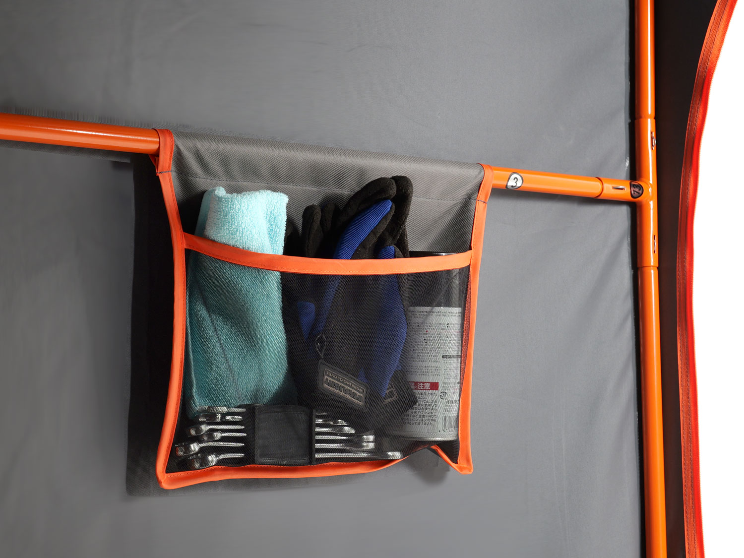 付属のメッシュポケットは、吊り下げ式に変更しました。