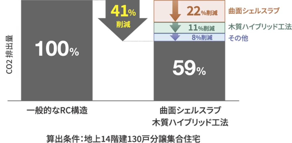 本建築モデルでは、地上14階建て130戸の分譲集合住宅において、VUILDが保有する特許技術を活用した「曲面シェルスラブ木質ハイブリッド工法」にて建築時のCO2排出量を約40%削減いたします。なお、三井不動産株式会社と株式会社日建設計で作成したマニュアルをベースに、不動産協会によって策定された「建設時GHG排出量算出マニュアル」※2を 適用し、CO2排出量を算出しております。