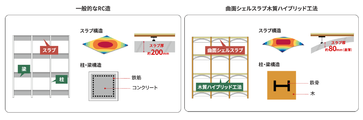 一般的な集合住宅の床を支えるスラブは、約200mm程度のスラブ厚が必要とされています。一方、曲面シェルスラブ木質ハイブリッド工法では、VUILDのデジタルファブリケーション技術を活用し、床スラブを曲面形状とすることで、荷重を効率よく分散させます。これにより、スラブ厚を最薄約80mm程度まで抑えることができるため、建築時に使用するコンクリート量の削減を可能にします。さらに、スラブ形成時の型枠を内装仕上げ材としても活用することで、内装の木質化によるCO2削減にも寄与します。