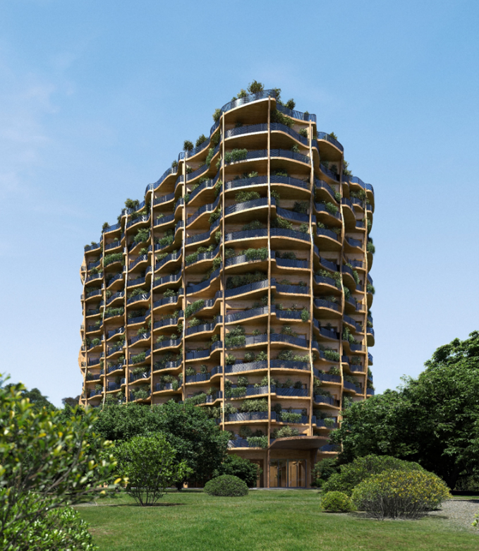 本建築モデルでは、地上14階建て130戸の分譲集合住宅において、VUILDが保有する特許技術を活用した「曲面シェルスラブ木質ハイブリッド工法」にて建築時のCO2排出量を約40%削減いたします。なお、三井不動産株式会社と株式会社日建設計で作成したマニュアルをベースに、不動産協会によって策定された「建設時GHG排出量算出マニュアル」※2を 適用し、CO2排出量を算出しております。