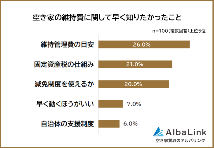 空き家の維持費については、事前に全体像を知っておきたかったという思いが強く表れています。毎年どの程度の費用がかかるのか、どんな支出が続くのかといった将来の見通しが立たないと不安だからですね。
