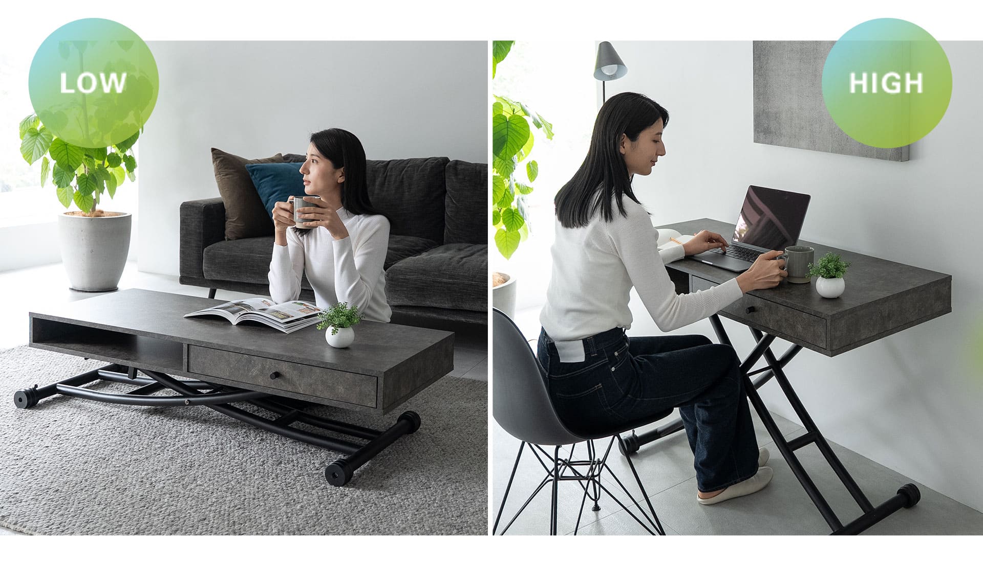 高さを調節できる昇降機能により、暮らしのシーンに柔軟に対応します。床に近い目線でくつろぎたい時も、ソファに座って作業をしたい時も。その時々の過ごし方に合わせて、高さをカスタマイズ。シーンに合わせた高さに昇降できることで、適切な作業姿勢を維持し、身体への負担を軽減します。