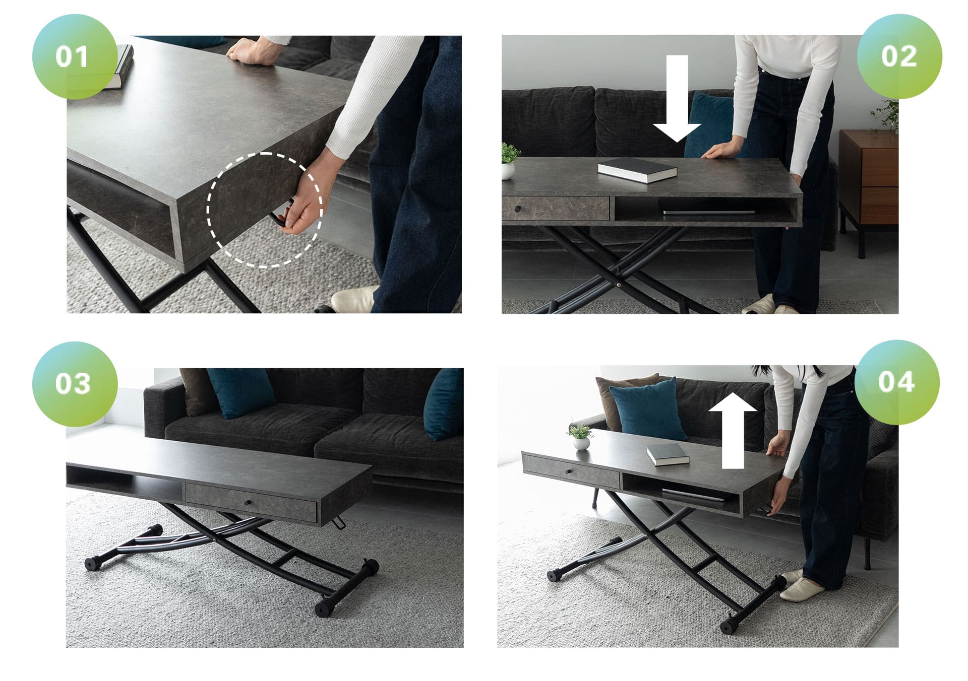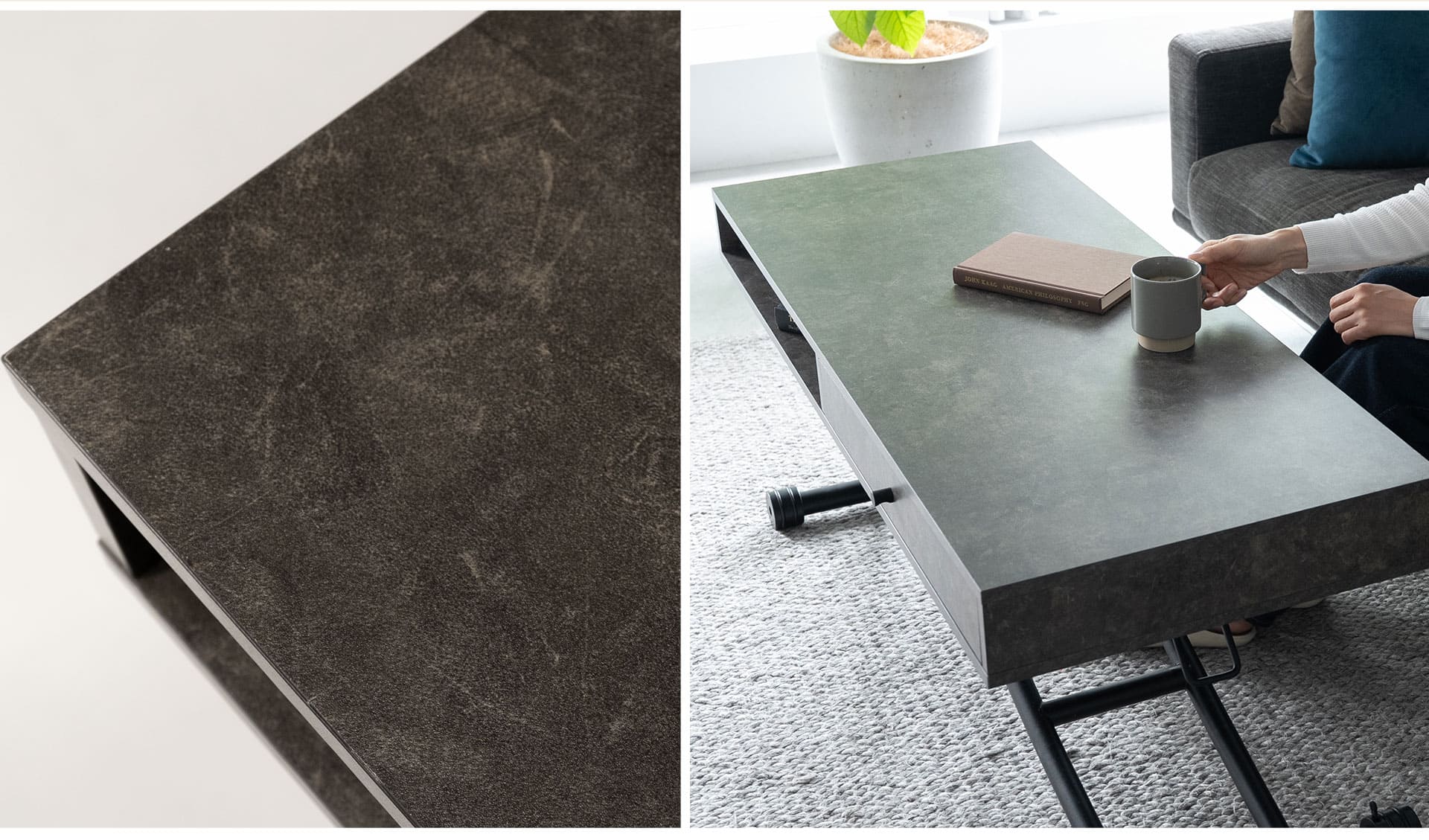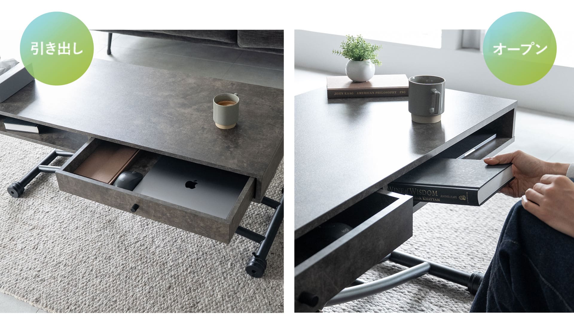 高さを調節できる利便性に加え、 引き出しとオープン収納を備えることで、 天板の上をすっきり保ち、生活感を抑えた空間づくりを叶えます。 実用性だけでなく、見た目の美しさや質感にもこだわった、 ワンランク上のリビングテーブルです。