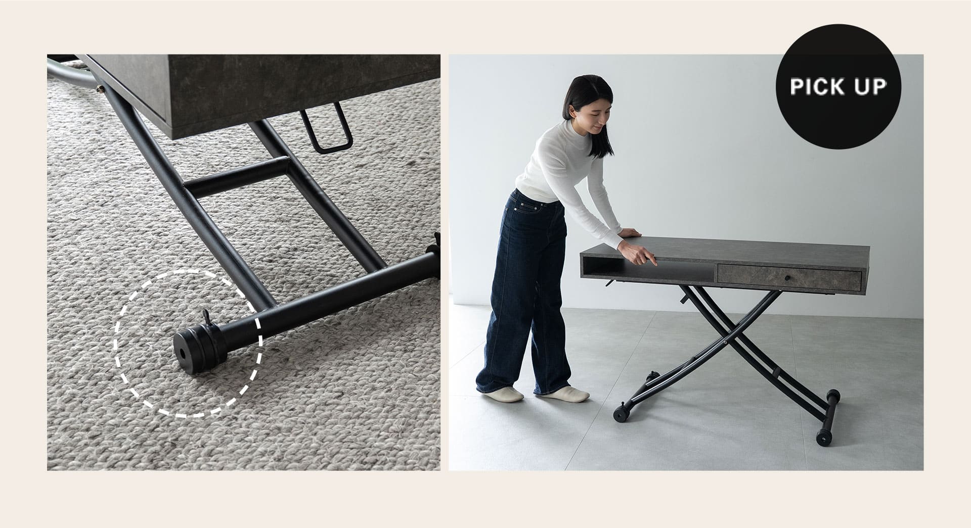 食事を並べても、作業道具を広げても、どこか余裕を感じられる広々とした天板設計。複数人で囲んでも圧迫感が出にくく、大理石ような風合いで、インテリアを高級感のある印象に。さらに、質感や脚のデザイン、キャスターの細部までこだわることで、昇降テーブルにありがちな無骨さを感じさせません。
