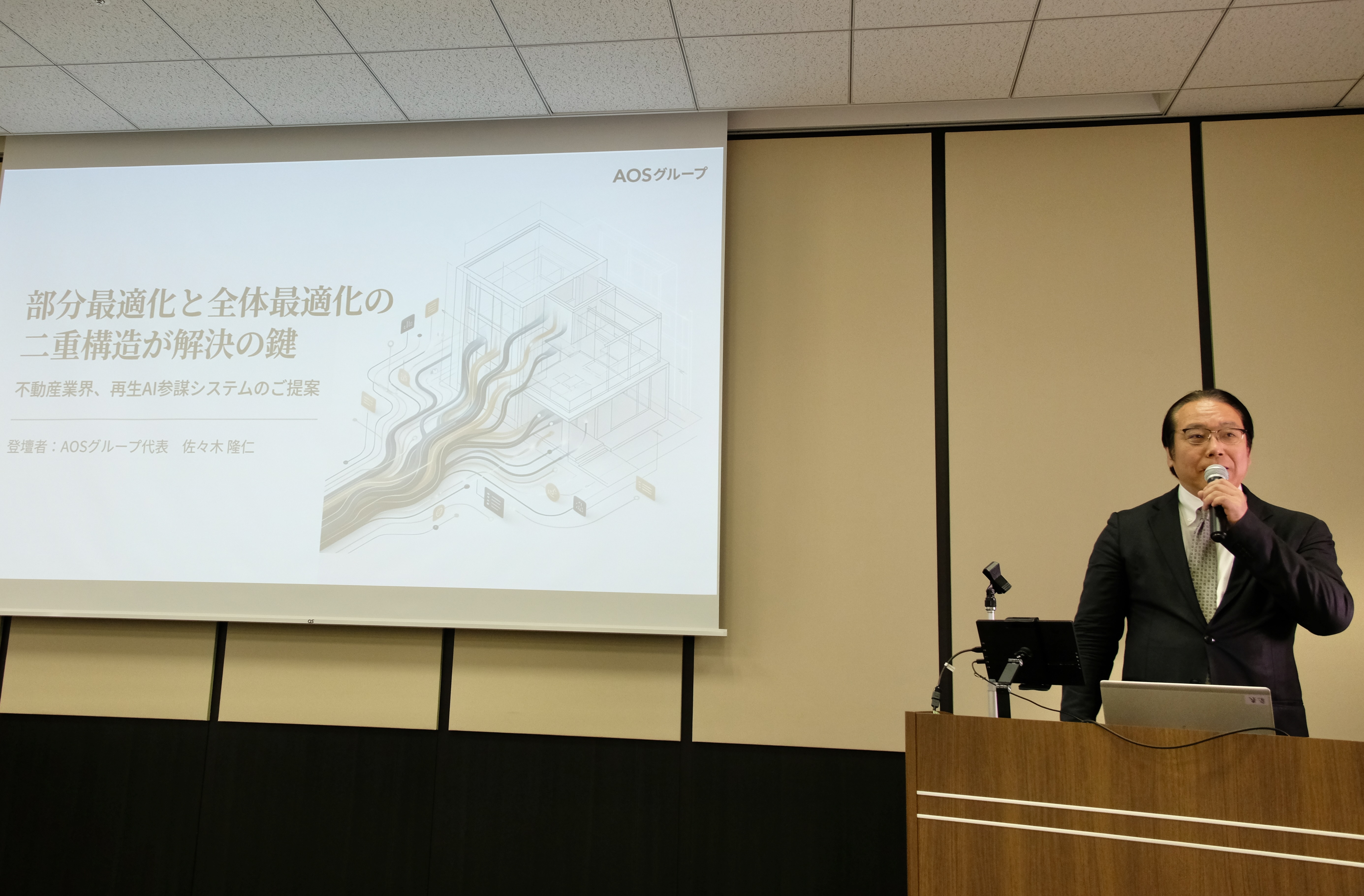 弊社代表の佐々木は、不動産業界では現場で求められる「部分最適」と、経営が目指す「全体最適」が相反し、DX推進の障壁となっている点を指摘しました。紙・Excel・属人化が根強く残る業務では、情報が部門間で分断され、意思決定の遅れやナレッジ継承の断絶が生じていると述べました。その解決には、現場の即応性と経営の知識活用を両立する“二重構造”のAIアプローチが必要とし、AIによって非構造データを統合・活用できる「再生AI参謀システム」を提案しました。これは、ベテランの知見を組織全体に還元し、意思決定の質を高める仕組みです。AIを現場の支援ツールに留めず、組織知の中核として活用することが、真の不動産DXの実現に不可欠であり、業界に眠るデータ資産を再生し、全体最適化と現場の成果向上を両立させることが、今後の不動産DX・AXの本質であると総括しました。