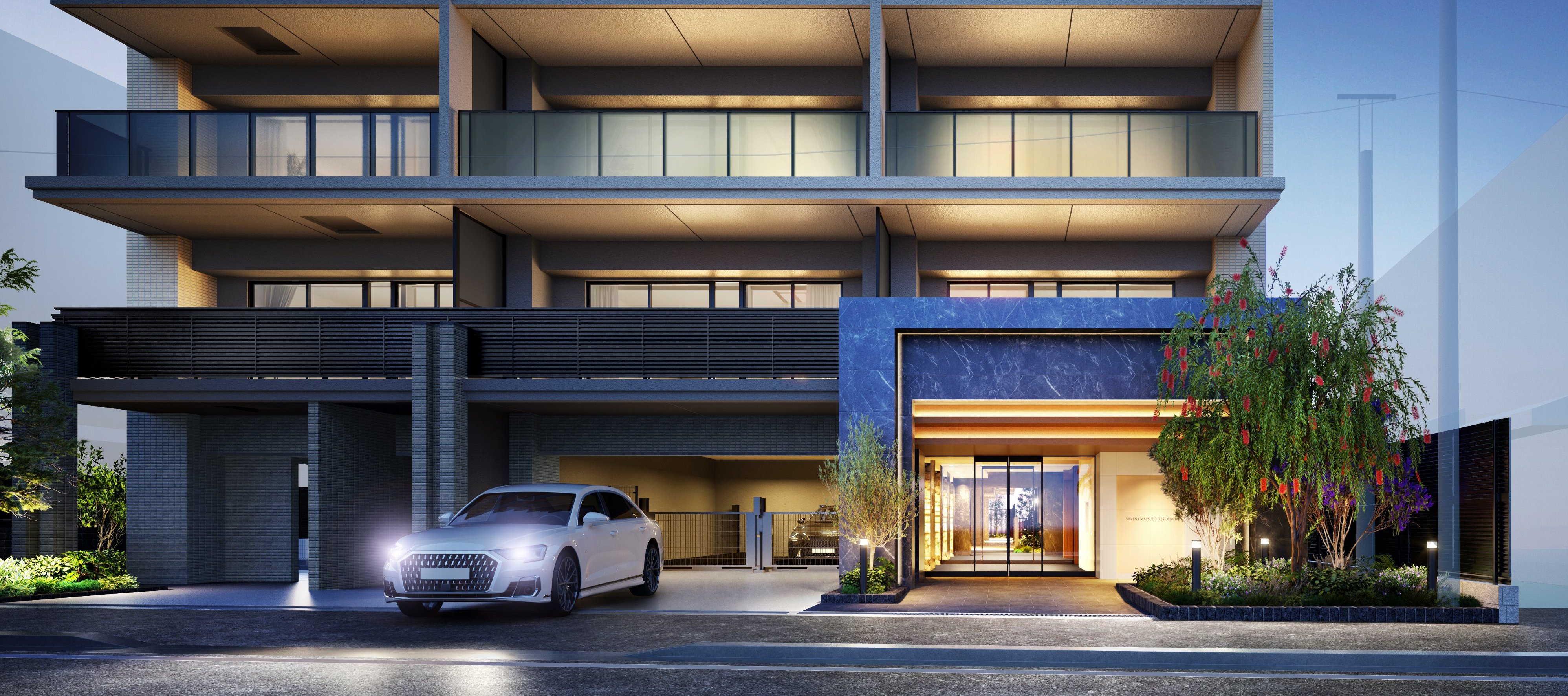 洗練さを追求したユーロデザインの外観は、街並に調和するアースカラ―のタイルを基調とし、コーナーサッシ、ガラスを効果的に用いた、表情豊かなファサードを目指しています。エントランスは、高さを確保した門構えデザインを施し、優美で上質な迎賓空間としています。