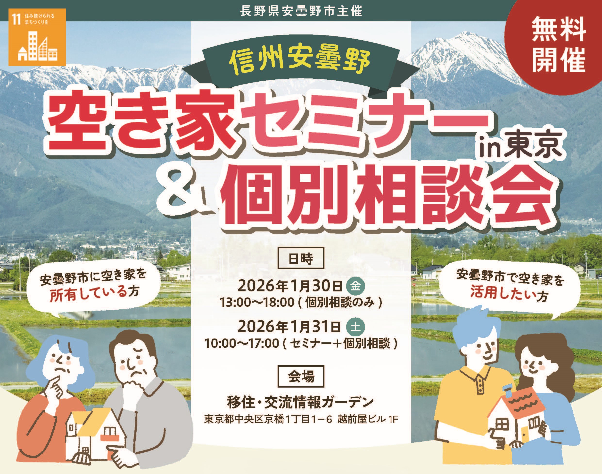 長野県安曇野市では、東京近郊在住で市内に空き家を所有する人と、安曇野市で空き家を活用したい人の両者に向けたセミナーと空き家相談会を東京で開催します。