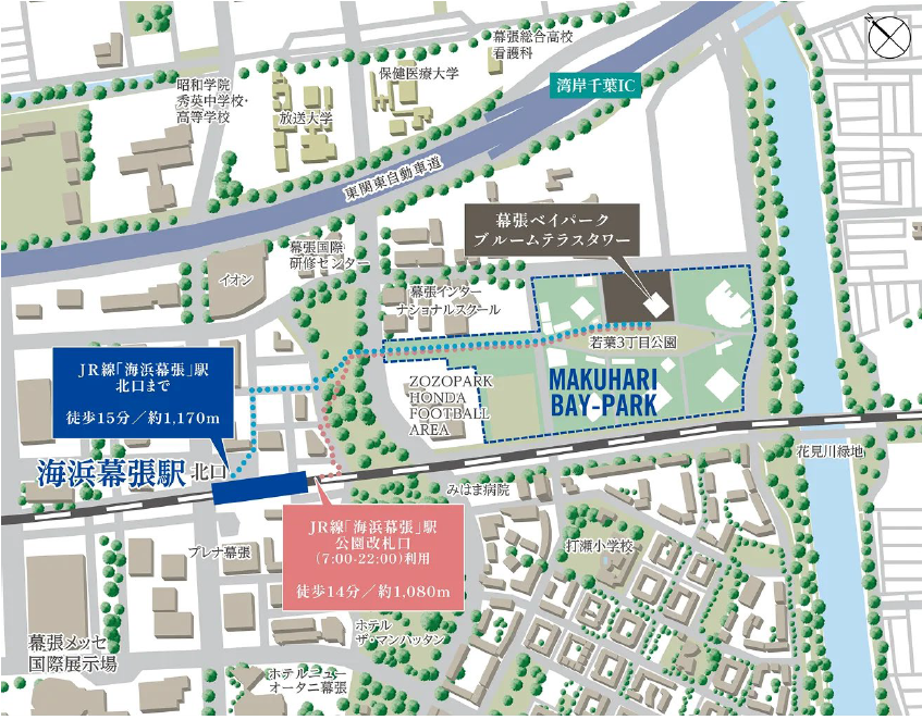 京葉線「海浜幕張」駅 徒歩15分 【北口利用】 ※京葉線「海浜幕張」駅 徒歩14分【公園改札口(7:00-22:00)利用】 |