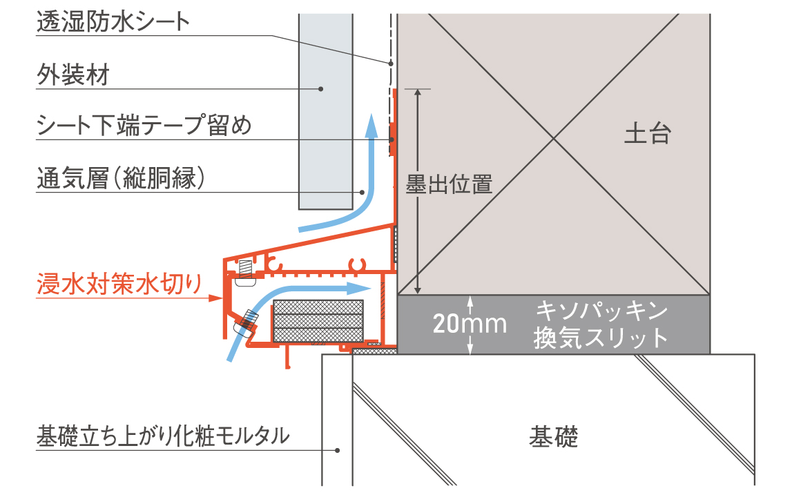 床下換気に必要な有効換気面積を確保しつつ、有事の際には「水膨張不織布」が膨れ、基礎内部への浸水をストップ。