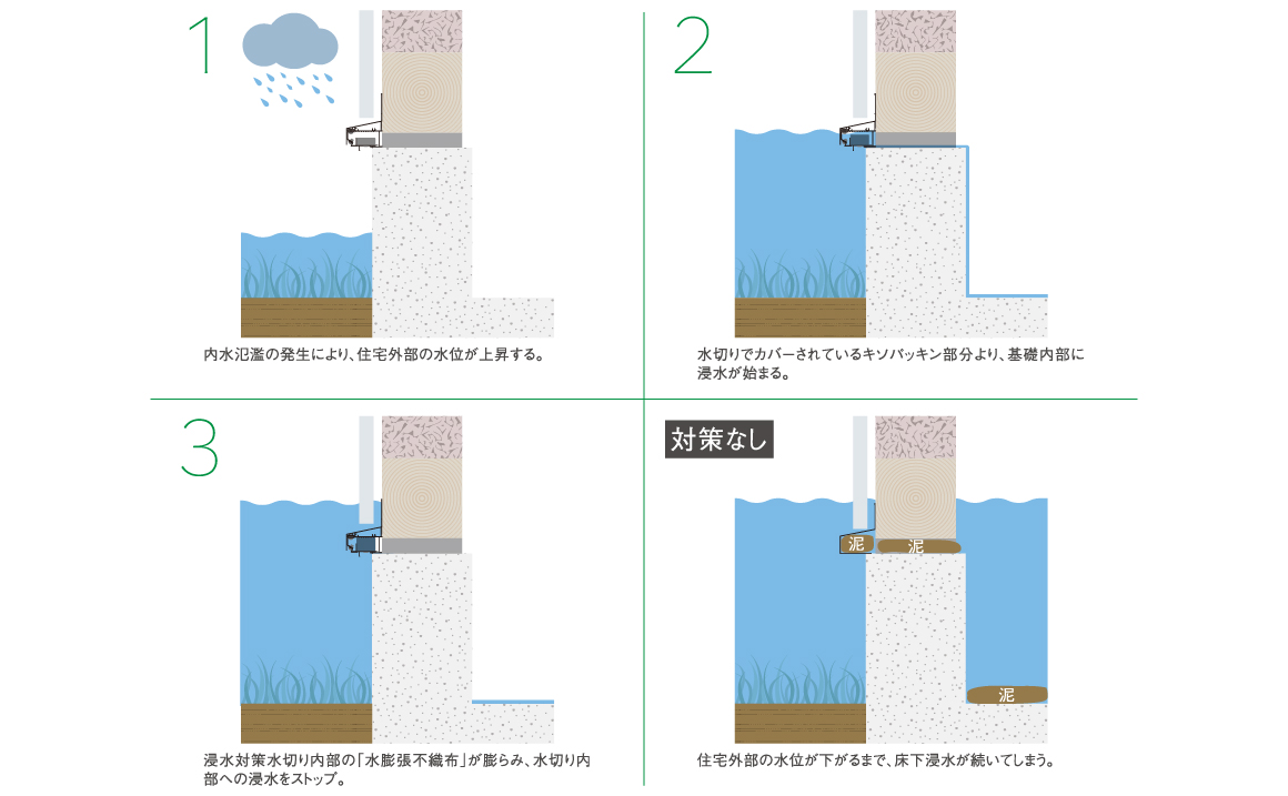 内水氾濫などの水害発生時、本体に内蔵された「水膨張不織布」が膨らむことで床下への浸水を防ぎ、復旧の負担を大幅に軽減します。