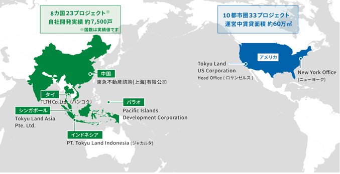 1973 年にグアムで宅地造成に着手し、海外事業はスタートしました。米国およびアジアの9か国で事業実績があり、6 拠点にて56プロジェクトに参画しています(2025年3月31日時点)。米国では、ニューヨークにて保有しているオフィスビル425 Park Avenueの他、リノベーションにより不動産の資産価値を高めるバリューアド事業を中心に展開し、優良な賃貸資産ポートフォリオを構築しています。アジアでは、1975 年にインドネシアに進出して以来、日本で培った開発ノウハウを活用した自社主導による住宅開発を通じ、地域社会に貢献してきました。近年、アジア全域の成長性に着目し、シンガポール・マレーシア・中国・タイ・ベトナム・インド等のアジア諸国へ事業領域を拡大しています。