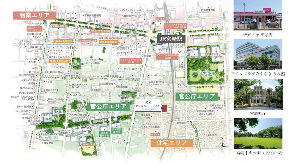 JR「宮崎」駅周辺は商業エリア・官公庁エリア・住宅エリアに分かれており、本物件は官公庁エリアにほど近い住宅エリアに位置します。周辺には生活利便施設が多く、スーパー「ナガノヤ」まで徒歩3分、駅前の「アミュプラザみやざき うみ館」まで徒歩7分で日常の買い物から外食・ショッピングまで充実した環境です。また「宮崎中央公園(文化の森)」まで徒歩5分、「宮崎県庁」まで徒歩10分と、自然豊かでありながら利便性も兼ね備えた立地です。