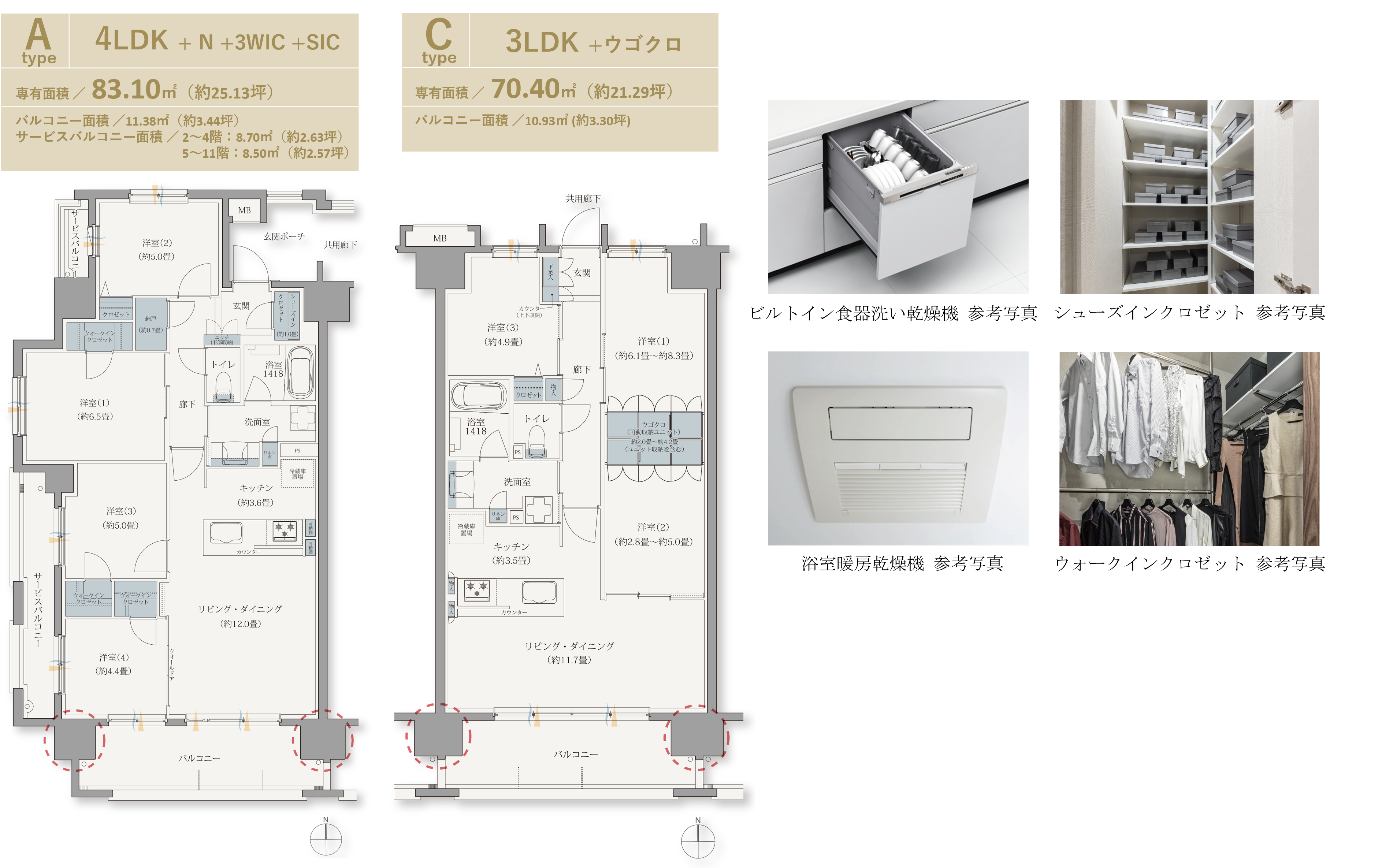 本物件は3LDK 67.65㎡~4LDK 83.10㎡の全邸南向きのプランバリエーションを揃えました。片付けの負担を軽減する「ビルトイン食器洗い乾燥機」や雨の日や夜の洗濯物乾燥にも便利な「浴室暖房乾燥機」などの設備を採用したほか、一部住戸にはシューズインクロゼットやウォークインクロゼットなどの収納スペースもご用意し、ゆとりある設計としました。