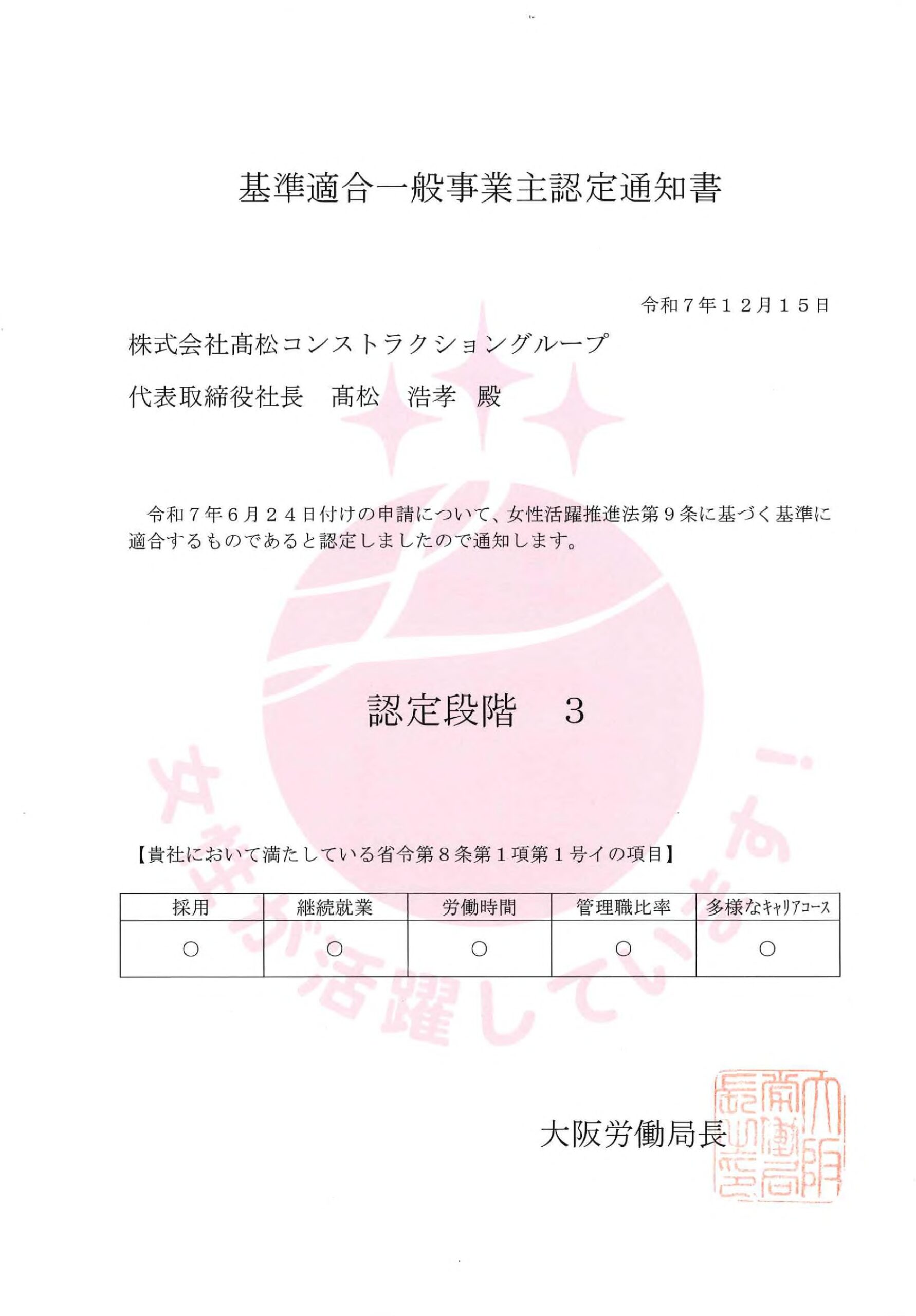 株式会社髙松コンストラクショングループ(本社:大阪市淀川区新北野1-2-3、代表取締役社長:髙松 浩孝)は、女性活躍推進法に基づく優良企業として、2025年12月15日付で厚生労働省が認定する「えるぼし認定(3つ星/3段階目)」を取得しました。