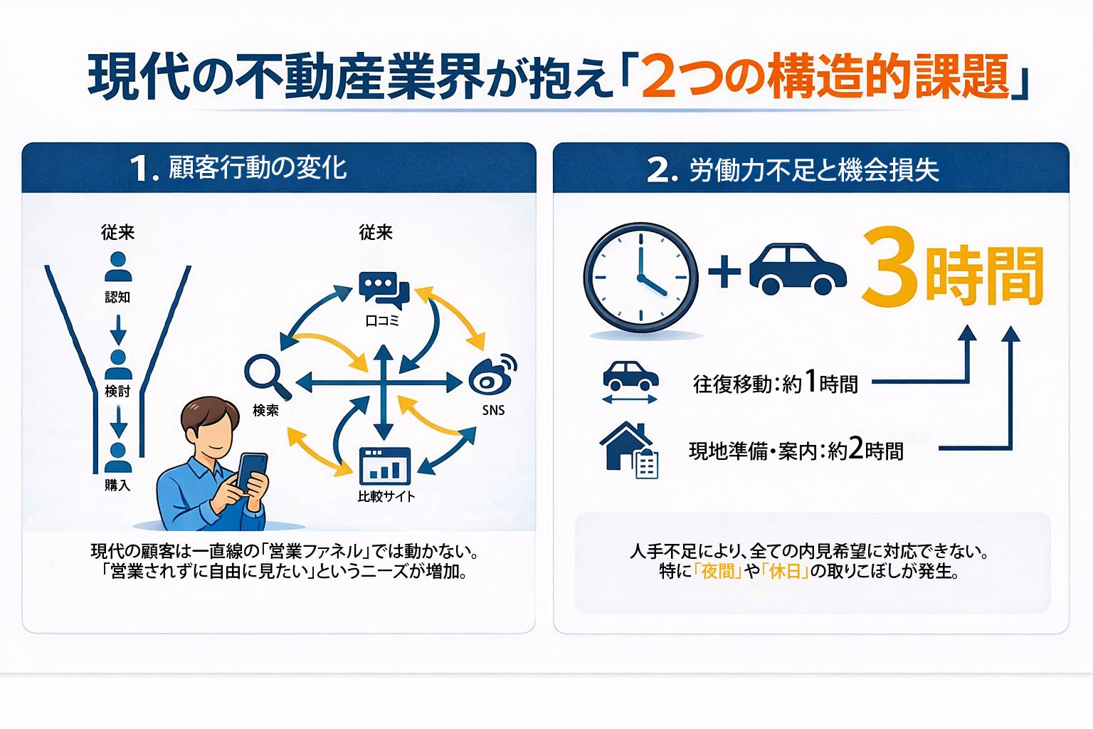 近年、中古マンション市場の流通が活性化する一方で、不動産業界は慢性的な人手不足に悩まされています。これまでの内見業務には、鍵の受け渡しや現地への移動など、多くの「移動工数」と「待機時間」が発生しており、営業担当者の大きな負担となっていました。